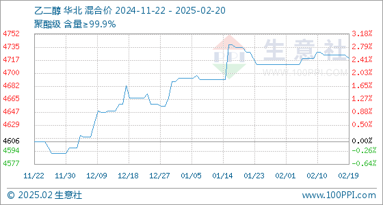 2月20日,生意社乙二醇基准价为4720.00元/吨,与本月初(4711.67元/吨)相比,上涨了0.18%。