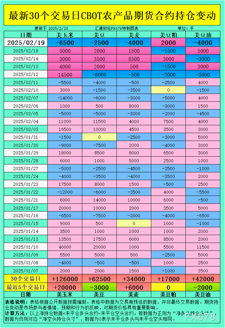 豆粕:尽管豆粕的需求较为稳定,但由于全球供应充足,市场未能形成强烈的上涨动力。2月19日,基金对豆粕的持仓变化持平,反映出市场对豆粕价格走势的谨慎态度。
