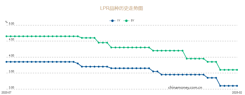 中国人民银行授权全国银行间同业拆借中心公布,2025年2月20日贷款市场报价利率(LPR)为:1年期LPR为3.1%,5年期以上LPR为3.6%,均较上期维持不变。