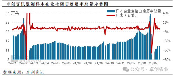 卓创资讯监测2025年2月19日样本企业生猪日度屠宰总量为13.82万头,环比(较上一工作日)减幅1.32%。