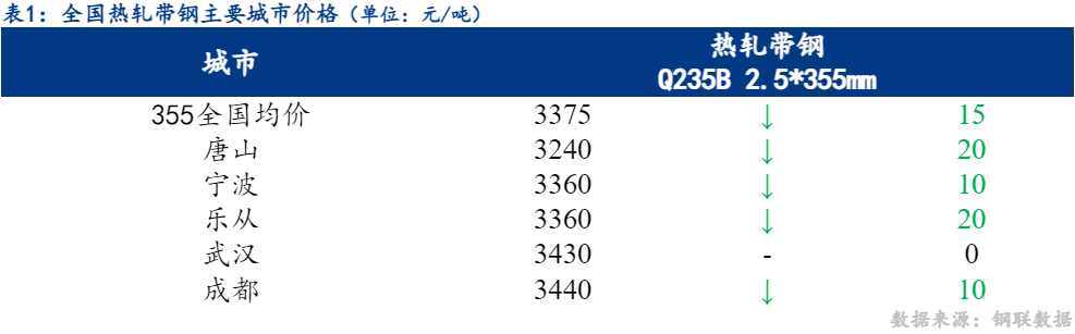13日热轧带钢全国主要城市价格主降个稳,截至发稿时2.5*355mm热轧带钢均价3375元/吨,较上昨下跌15元/吨,其中2.5*355mm主要城市报价为唐山3240元/吨,宁波3360元/吨,乐从3360元/吨。