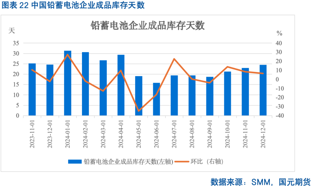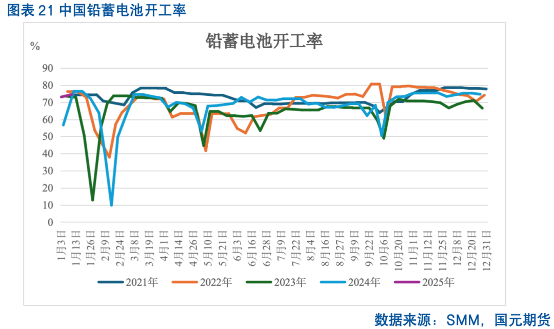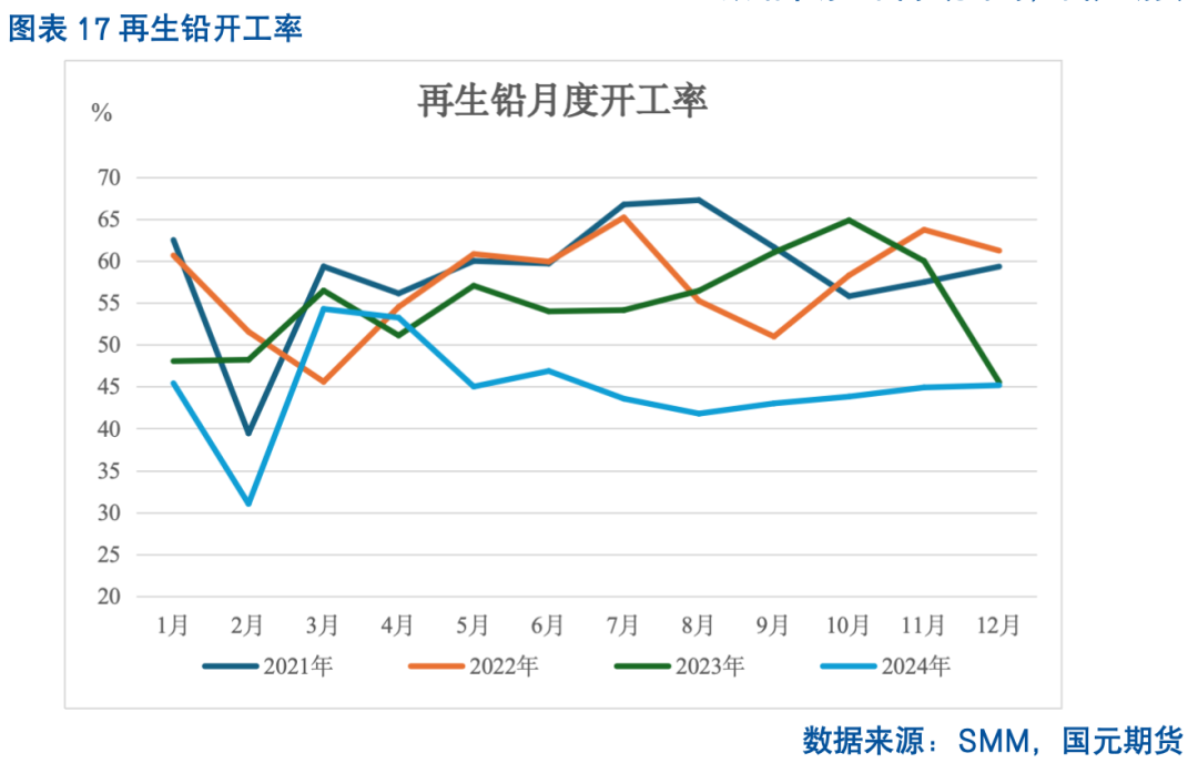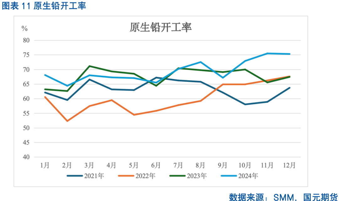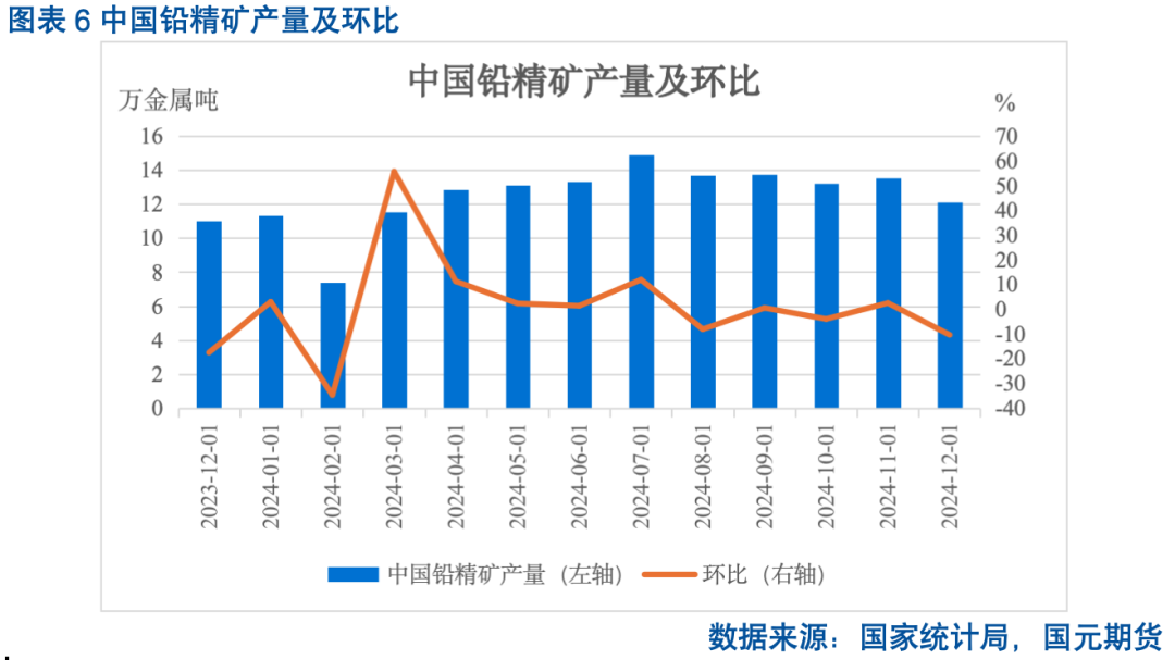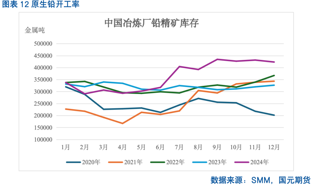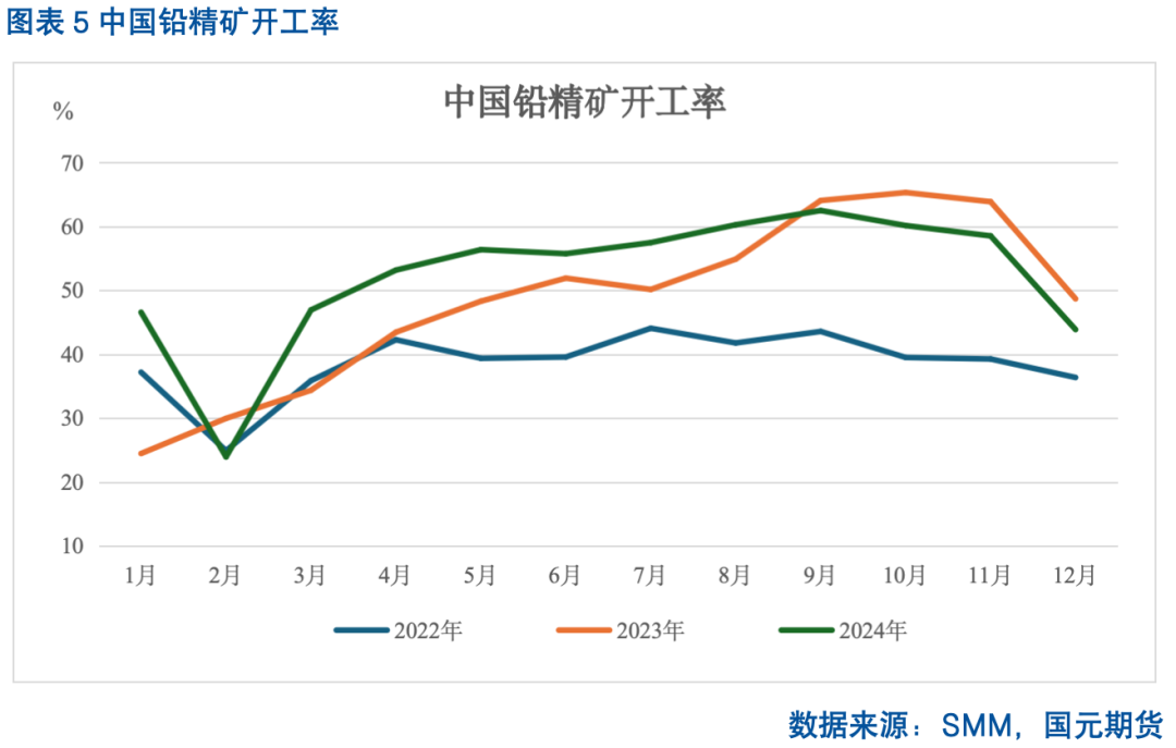 国内矿山方面,12月气温下降,矿山因采掘成本增加,陆续进入季节性检修阶段,12月铅精矿产量环比大幅下降10.41%,开工率大幅下滑14.65个百分点。