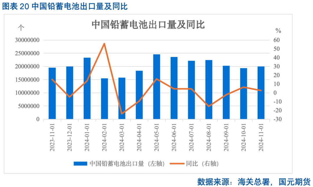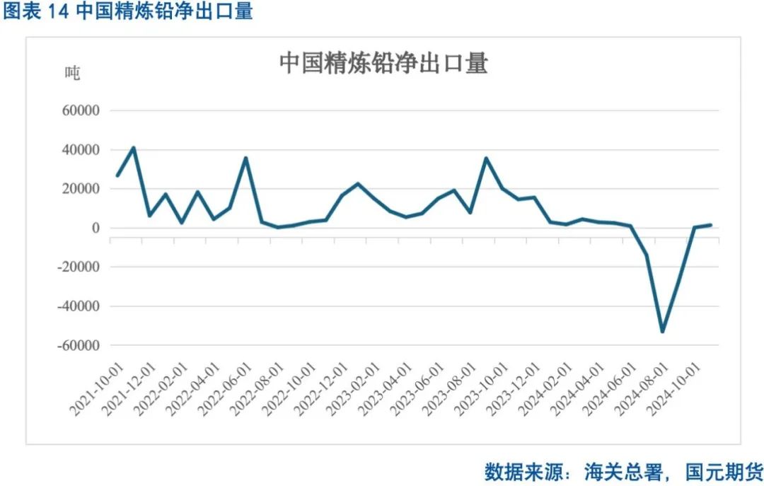 WBMS数据显示,2024年11月,全球精炼铅产量为115.01万吨,消费量为116.89万吨,供应短缺1.87万吨。2024年1-11月,全球精炼铅产量为1221.59万吨,消费量为1228.16万吨,供应短缺6.57万吨。