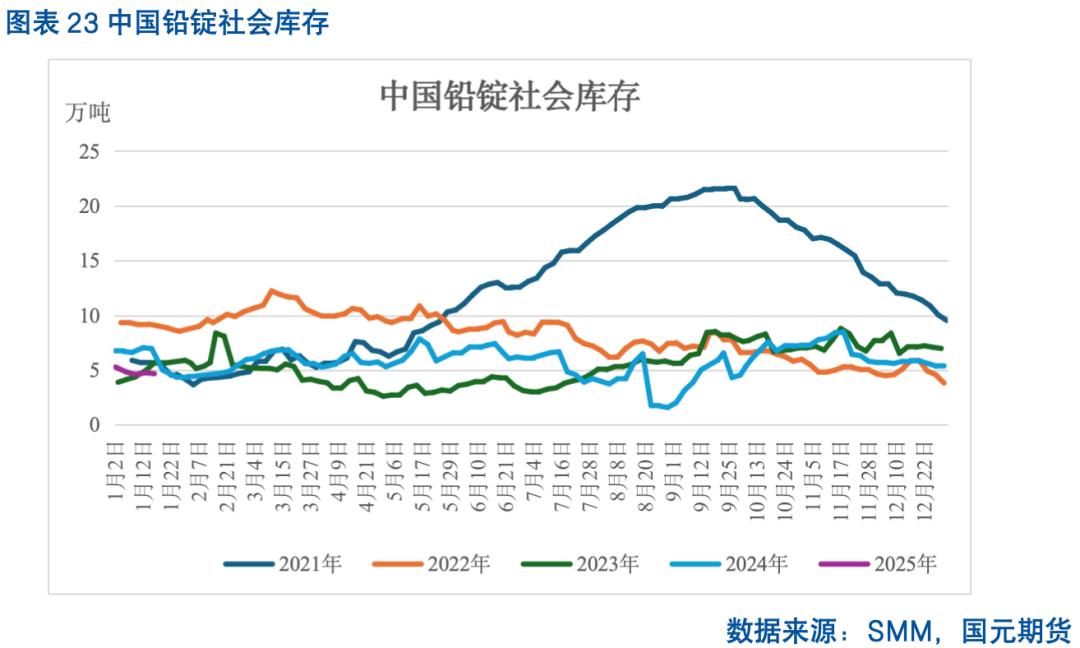 1月临近春节假期,物流运转周期延长,下游企业就近补库,叠加铅锭持货商年前甩货,带动铅锭社会库存下滑,截至1月23日,铅锭社会库存较月初下滑1.37万吨。
