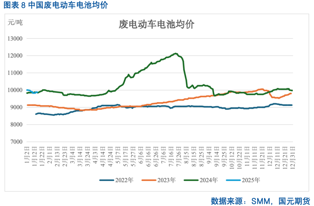 1月上半月,环保限产对再生铅生产的扰动减少,再生铅冶炼厂积极复产,对原料需求增加,同时,冶炼厂为春节假期积极备库,废电瓶需求整体向好,截至1月17日,再生铅原料库存较上月同期增加6.4万吨,增幅40.52%,已达到往年春节假期前备库的常规水平。但废电瓶价格不升反降,截至1月3日,废电动车电池均价为9875元/吨,较上月同期跌175元/吨;废白壳均价为9525元/吨,较上月同期跌150元/吨;废黑壳均价9925元/吨,较上月同期跌200元/吨。