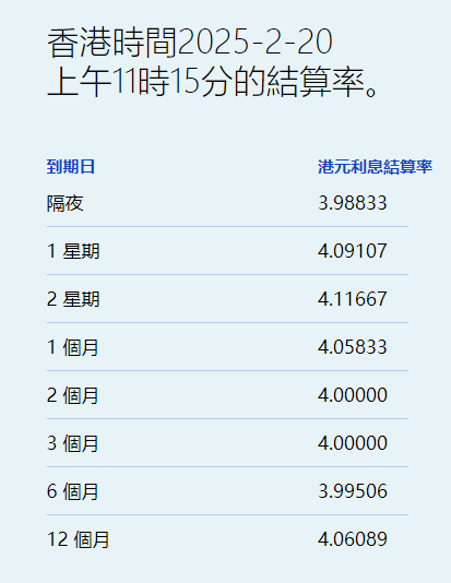 2月20日,港元三个月以下拆息全线向下,其中,隔夜息跌穿4%,报3.98833%,见近一周新低,与楼按相关的一个月拆息亦结束五连升,降至4.05833%。