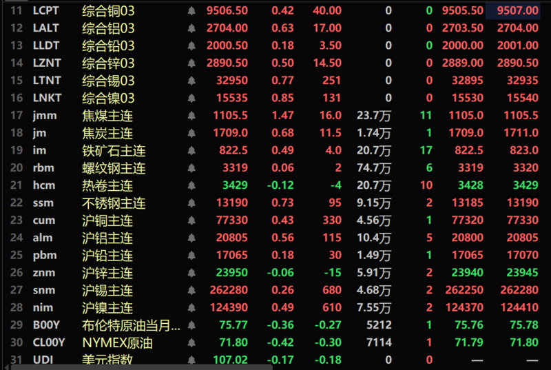 黑色系多飘红,铁矿涨0.49%,螺纹微涨,热卷跌0.12%,不锈钢涨0.73%。双焦方面,焦煤涨1.47%,焦炭涨0.68%。