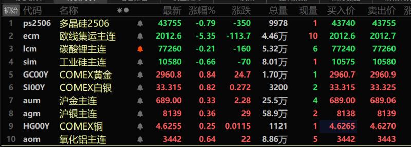 此外,氧化铝涨0.64%。碳酸锂跌0.21%,工业硅跌0.66%。多晶硅主力期货跌0.79%。