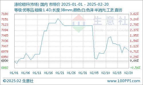 国内涤纶短纤市场货源供应相对宽松,下游按需采购成交清淡。近期(2月12-20日)价格呈现小幅走弱,据生意社商品行情分析系统,截止2月20日,国内涤纶短纤(1.4D*38mm)市场均价在6985元/吨,下跌1.06%,江浙地区主流工厂出厂均价在7276元/吨,下跌0.68%。