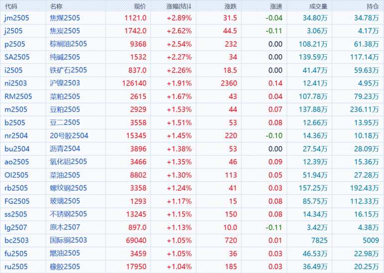2月20日,午盘收盘,国内期货主力合约涨多跌少。焦煤、焦炭、棕榈油、纯碱、铁矿石涨超2%,沪镍、菜粕、20号胶涨超1%;跌幅方面,集运欧线跌近3%,液化石油气(LPG)跌超1%。