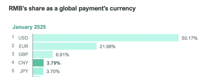 环球银行金融电信协会(Swift)2月20日发布的人民币月度报告和数据统计显示,今年1月,在基于金额统计的全球支付货币排名中,人民币保持全球第四大最活跃货币的位置,占比3.79%,2024年12月占比为3.75%。