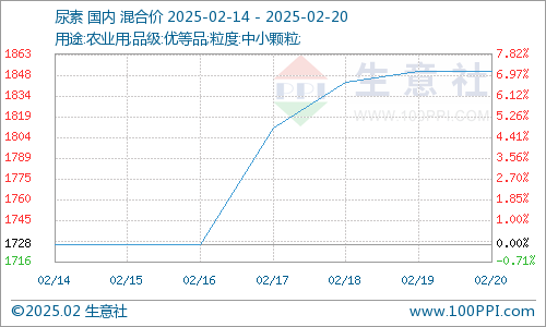 据生意社商品行情分析系统,截止2月20日,国内尿素市场参考均价为1851元/吨,较2月14日参考均价1728元/吨,国内尿素市场价格上涨幅度为7.11%。