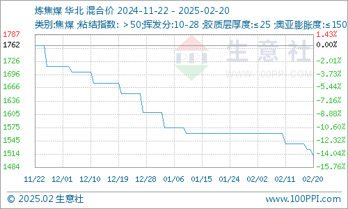 本周炼焦煤市场弱势下行。据生意社监测系统显示,截止2月20日,生意社炼焦煤价格指数在1509.75元/吨,较月初下降-3.36%。