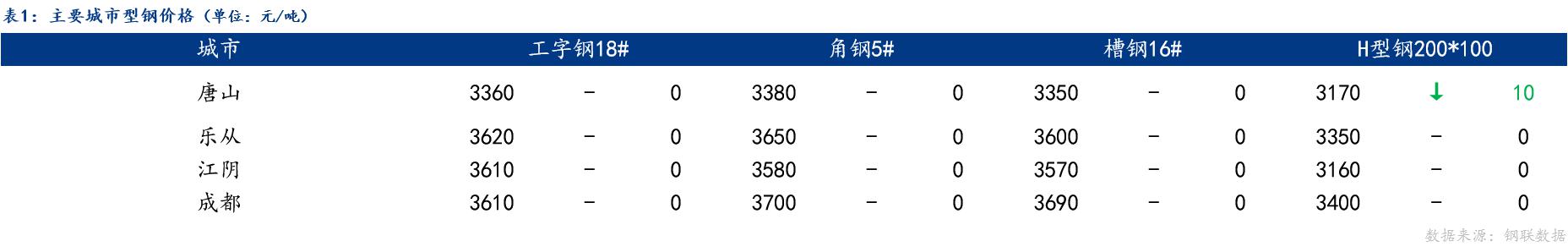 今日型钢价格持稳运行,唐山槽钢、角钢、工字钢价格较上一交易日持稳,H型钢价格较上一交易日下跌10元/吨;乐从、江阴、成都工字钢、角钢、槽钢、H型钢价格较上一交易日持稳。