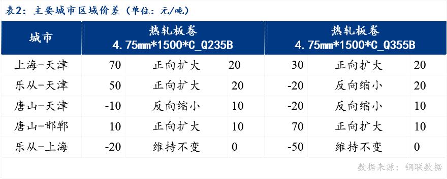 从区域价差来看,4.75mm普卷华南与华北价差50元/吨,华东与华北价差70元/吨,华南与华东价差-20元/吨。京津冀地区价差来看,唐山与天津价差-10元/吨,唐山与邯郸价差10元/吨。