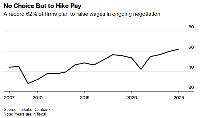 最新出炉的一项调查结果为日本央行进一步加息的前景提供了支持。根据日本市场研究公司Teikoku Databank的一项调查,在接受调查的1.1万家日本企业中,由于企业们正在努力招聘和留住员工,约有61.9%的受访企业计划在企业新财年提高员工工资,这一比例是有史以来最高的。此外,约56%的受访企业表示,计划提高基本工资,这一比例也是Teikoku Databank自2007年开始追踪这一问题以来的最高水平。