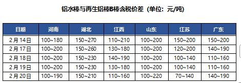 2月20日A00铝锭现货价华东20690,涨90;华南20680,涨90;中原20560,涨90(单位:元/吨)。下游逢低按需补货,棒厂调价出货为主,今日再生铝棒价格上涨50元/吨左右。