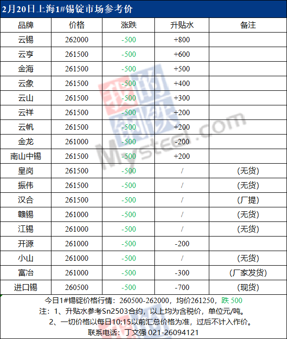 2月20日Mysteel上海现货锡锭报价260500-262000元/吨,均价261250元/吨,较上一交易日跌500元/吨,Mysteel15:30上海现货锡锭成交价格261500-264500元/吨,均价263000元/吨,较上一交易日涨1500元/吨。