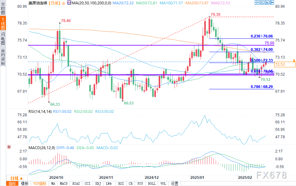 汇通财经APP讯——周四(2月20日)欧盘时段,轻质原油期货价格小幅上涨,交易员们关注着关键的50%回撤位72.08美元。目前,这一价格点位指引着近期的市场走向,因为若价格持续高于该点位,可能会引发看涨势头,推动价格向近期高点73.65美元迈进。