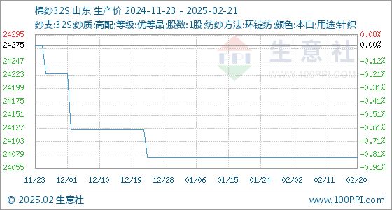2月21日,生意社棉纱32S基准价为24075.00元/吨,与本月初持平。