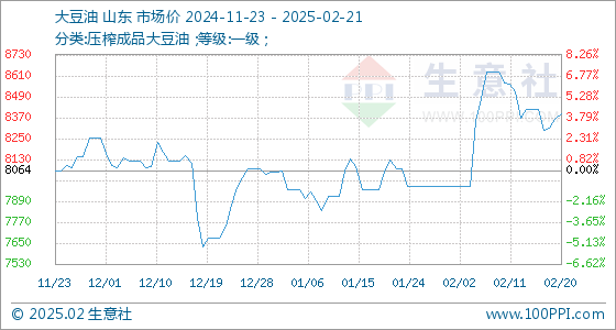 2月21日生意社大豆油基准价为8390.00元/吨
