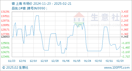 2月21日,生意社镍基准价为125341.67元/吨,与本月初(124516.67元/吨)相比,上涨了0.66%。