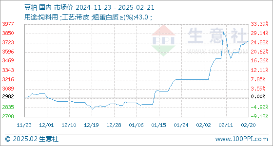2月21日,生意社豆粕基准价为3744.00元/吨,与本月初(3222.00元/吨)相比,上涨了16.20%。