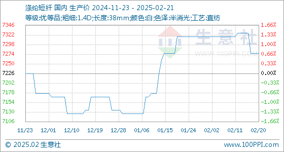2月21日,生意社涤纶短纤基准价为7276.67元/吨,与本月初(7318.33元/吨)相比,下降了-0.57%。