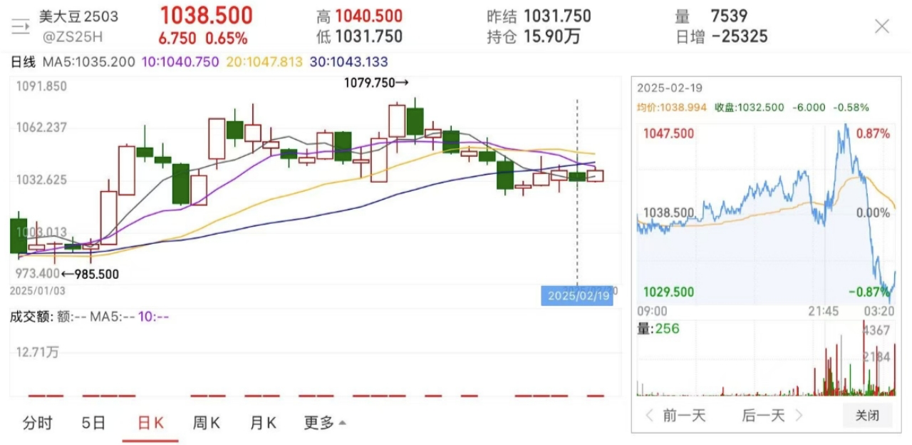 以2月18日收盘数据为例,CBOT大豆期货收盘上涨,其中基准期约收高0.2%,3月期约上涨2.50美分,报收1038.50美分/蒲式耳;5月期约上涨2.75美分,报收1055.50美分/蒲式耳;7月期约上涨3.25美分,报收1071.50美分/蒲式耳。