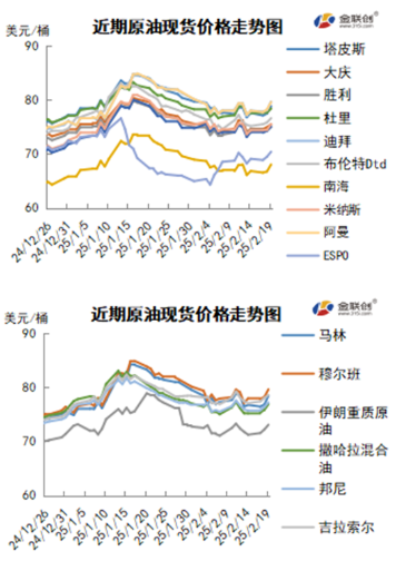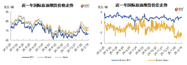 技术图上,WTI原油期货价格在当周先抑后扬。当周提振油价的主要因素:一是俄原油管道受到袭击导致CPC流量下降;二是美国因寒冷气候冻结油田;三是OPEC+可能推迟增产;四是美国意图将伊朗原油出口降低至每天10万桶;五是IEA上调2025年需求增长预测;六是美国宣布新关税生效时间或推迟到4月份;七是G7考虑收紧俄油价格上限。当周打压油价的主要因素:一是美国API商业原油库存增加;二是美国推动俄乌和谈;三是美国表示放松对俄罗斯的制裁可谈;四是美国油气钻机数连续第三周增加;五是俄罗斯1月原油产量仍略有上升。截至19日,WTI报收72.25美元/桶,环比上涨0.34美元/桶或0.48%;截至19日当周,WTI的周均价为71.53美元/桶,环比下跌0.19美元/桶或-0.27%。从技术形态上来看,标志着油价小幅看涨。