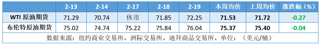 本周(2.13-2.19),原油整体呈现先抑后扬的走势,周均价环比下跌。