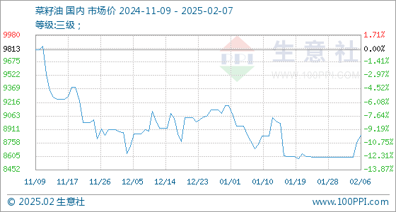 2月7日生意社菜籽油基准价为8841.67元/吨