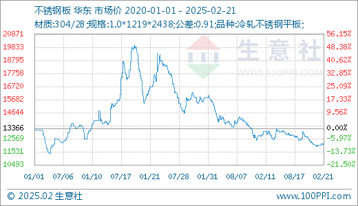 据生意社价格监测,本周不锈钢价格小幅上涨。截止2月21日,现货304/2B不锈钢平板1.0*1219*2438(公差0.91)的日均价为现报价12164.29元/吨,较周初上涨0.29%,同比下跌5.96%。