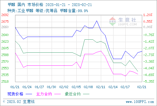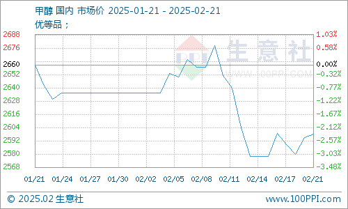 据生意社商品行情分析系统,2月14日至21日(截止15:00),国内甲醇市场华东港口均价自2599元/吨先跌后涨至2598元/吨,周期内价格跌幅0.03%,环比下跌2.35%,同比下跌0.67%。国内甲醇市场弱势震荡。国内甲醇装置产能利用率仍处高位,传统下游逐步恢复,虽周初下游外采对内地市场有所提振,但下游维持理性采购为主,整体内地市场弱势震荡运行为主。