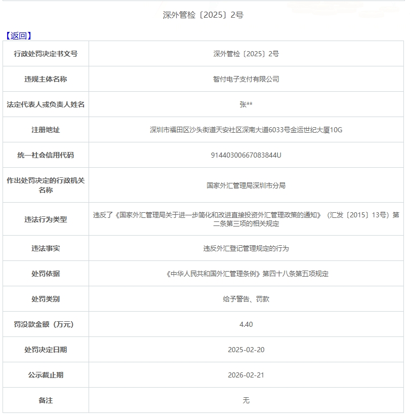 中国网财经2月21日讯日前,国家外汇管理局深圳市分局做出行政处罚,罚单显示,智付电子支付有限公司违反外汇登记管理规定的行为,违反了相关规定,被罚款44000元,处罚日期为2025年2月20日。