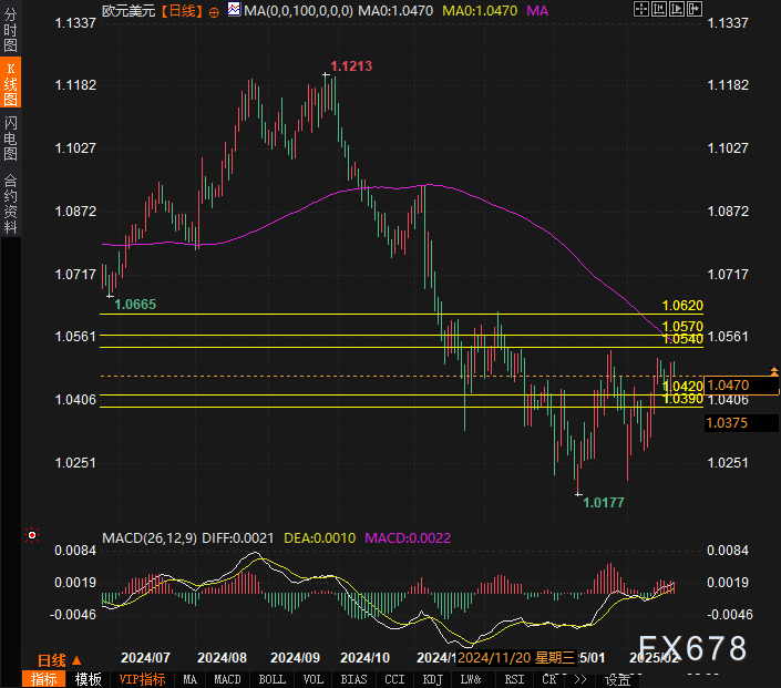 汇通财经APP讯——周五(2月21日),外汇市场迎来了一系列重大经济数据和政治风险事件。欧元兑美元(EUR/USD)在经历近期的回升后,面临着多重不确定因素的挑战。当前欧元交投于1.0467,较前一交易日下跌约0.32%,显示出市场对即将到来的德国大选以及欧元区经济数据的谨慎情绪。在这一波动的背景下,欧元走势仍受到美国美元的整体回撤和欧元区经济放缓的影响。