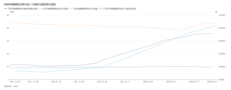 国内库存方面:截至2月20日周四,SMM全国主流地区铜库存较周一增加0.73万吨至35.76万吨,较上周四增加3.14万吨,较春节前增加19.18万吨,节后前两周累库幅度较去年同期多5.44万吨,为过去7年中累库量最多的一年。 具体来看,上海地区库存较周一增加0.57万吨至21.21万吨,江苏地区库存增加0.50万吨至6.4万吨。国产铜到货量增加是主因,周初交割货集中到货是主因,据统计目前上海仓单量为7.29万吨较上周五增加1.92万吨。广东地区库存持平周一,尽管近期广东消费量有所下降,但到货量也在减少,令该地区总库存变化不大。》点击查看详情