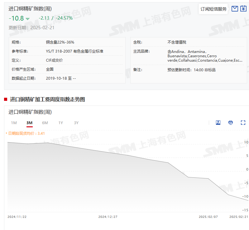 本周铜精矿现货TC成交重心继续下移, 2月21日SMM进口铜精矿指数(周)报-10.8美元/吨,较上一期的-8.67美元/吨减少2.13美元/吨。20%品位内贸矿计价系数为93%-95%。