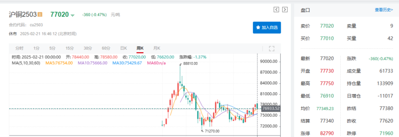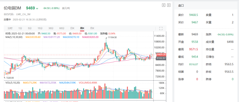 SMM2月21日讯:随着全球贸易前景的不确定性扰动铜价走势,铜库存节后的累库幅度高于多年同期施压铜价,且铜价波动使得本就处于需求淡季的企业采购愈发谨慎,即使矿端供应偏紧给予铜价较强支撑,但沪铜本周依然出现下跌,截至2月21日16:37分,伦铜跌0.99%,报9469美元/吨,其周线微跌0.08%;沪铜跌0.47%,报77020元/吨,本周跌幅为1.02%。