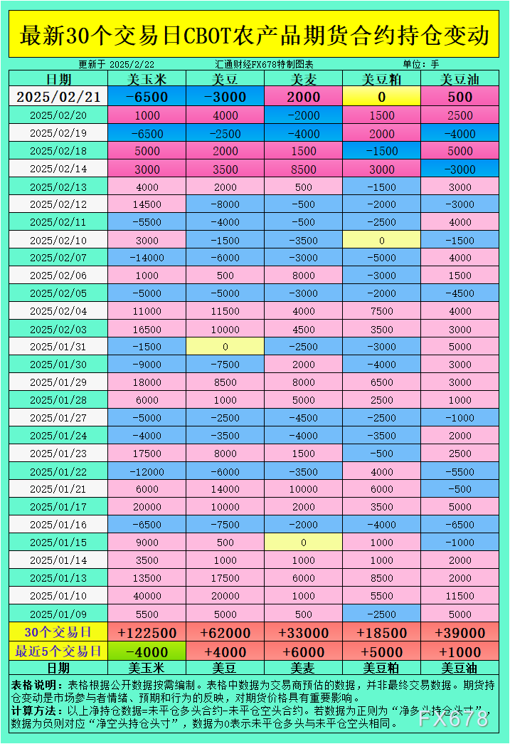大豆市场的情绪变化更加复杂。一方面,持仓数据显示,大宗商品基金在2025年2月21日增加了投机性净空头头寸3000手,表明市场有一定的看空情绪。另一方面,全球需求,尤其是来自欧洲市场的需求保持坚挺,这为大豆价格提供了支撑。