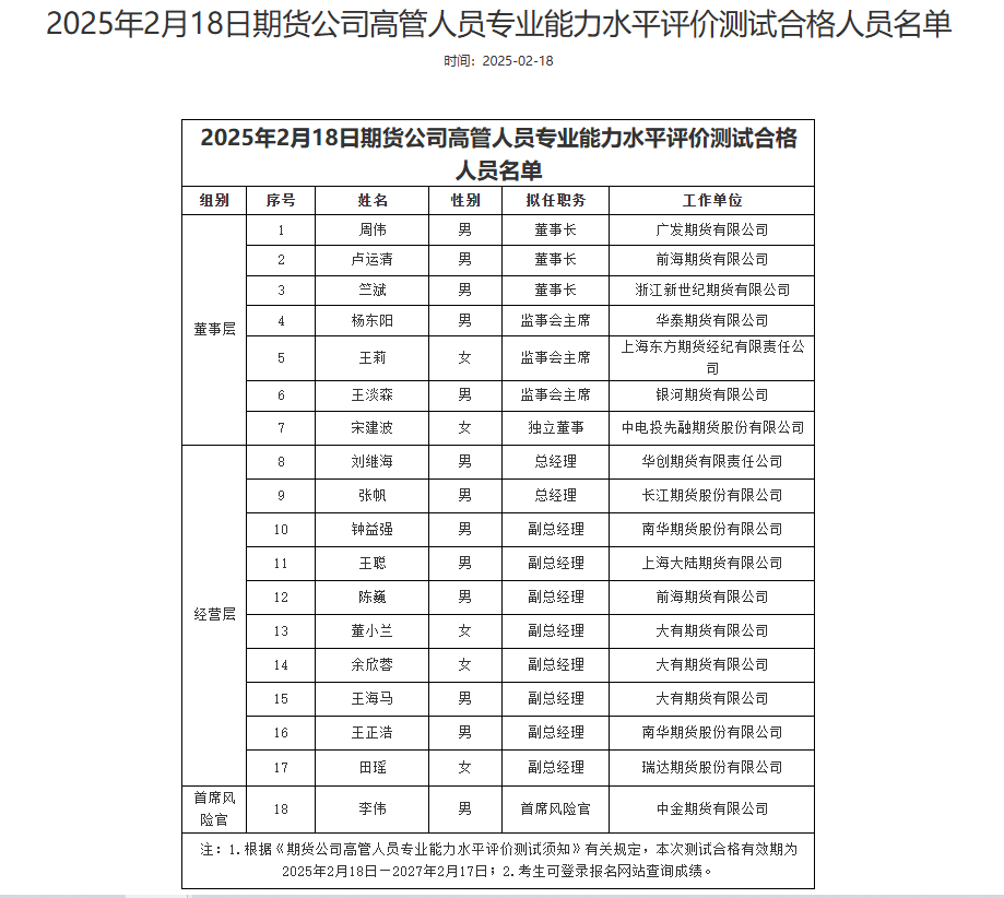 近日,中国期货业协会发布新一期期货公司高管人员专业能力水平评价测试合格人员名单。