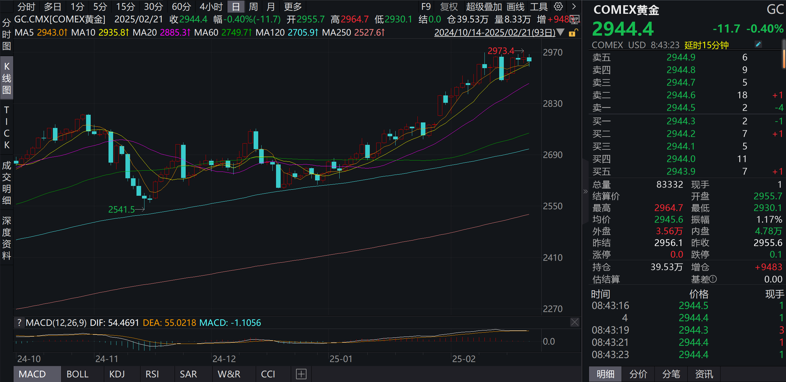 截至2月21日20时,COMEX黄金期货主力合约报价徘徊在2950.6美元/盎司附近,隔夜盘中一度创下历史新高2973.4美元/盎司。随着金价迭创新高,越来越多投行纷纷力挺金价将突破3000美元/盎司。