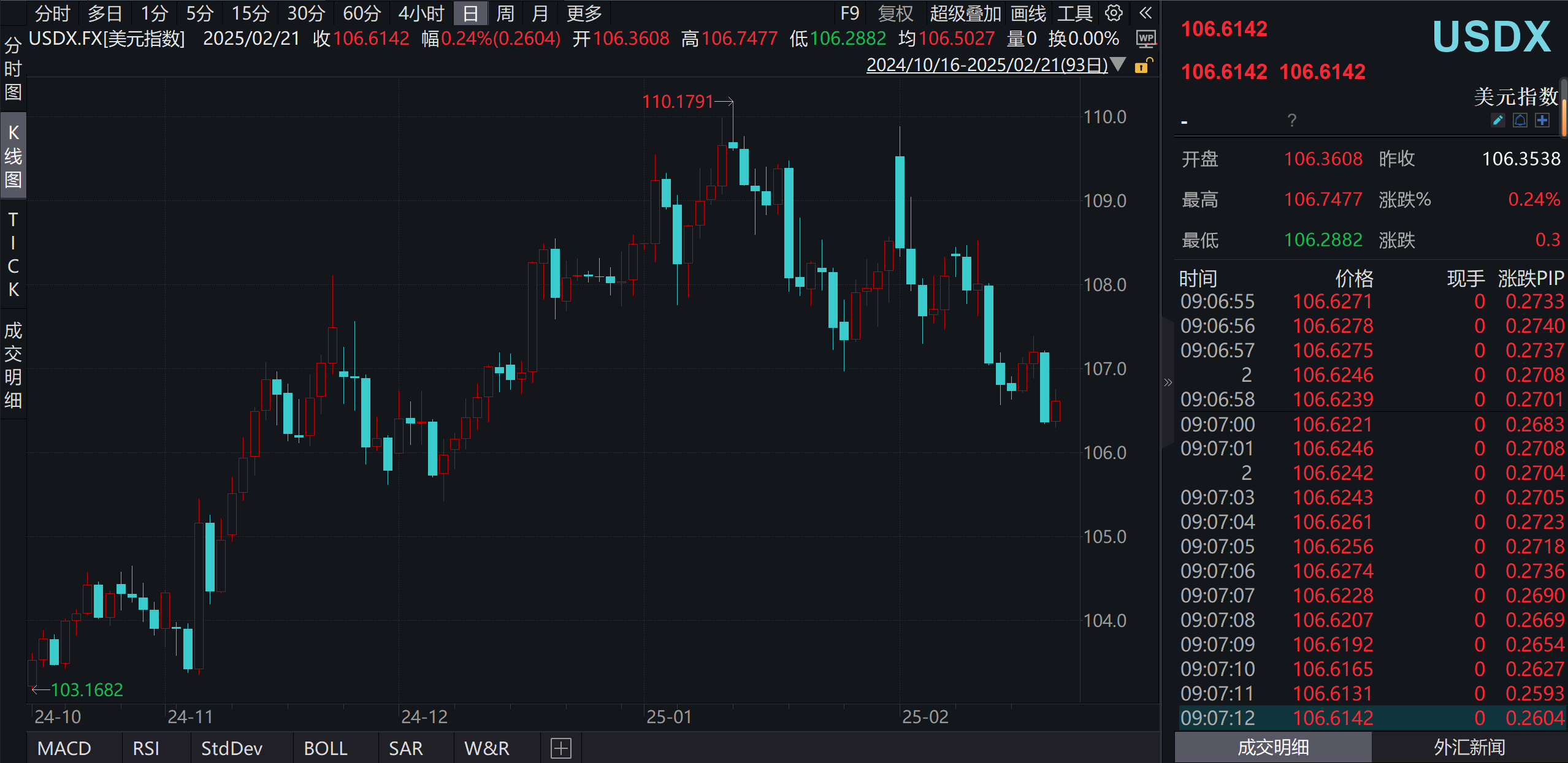 受此影响,2月11日当周,美元指数从108.44跌至106.8。截至2月21日20时,美元指数徘徊在106.66附近。