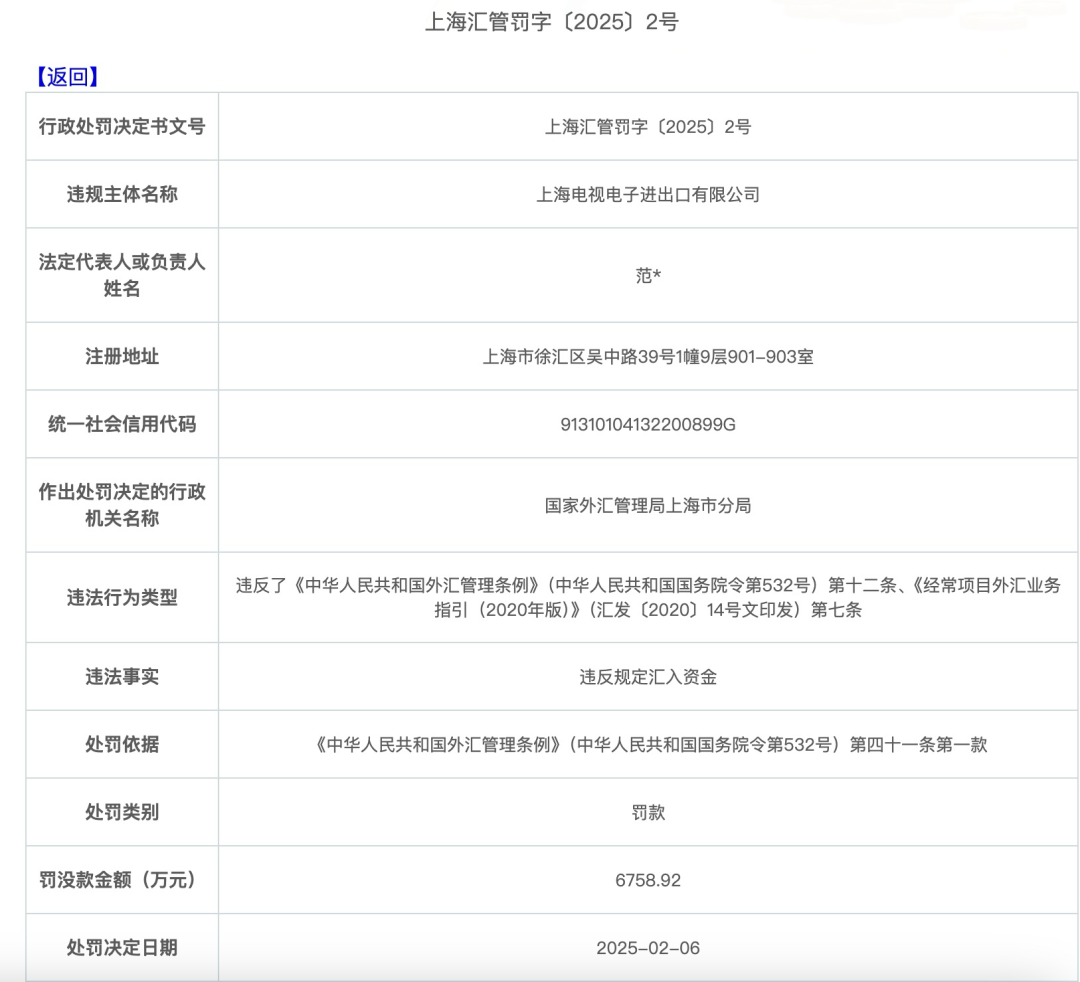 据国家外汇管理局上海市分局日前发布的消息,上海电视电子进出口有限公司因违反规定汇入资金被处以罚款6758.92万元。相关违法行为违反了《中华人民共和国外汇管理条例》第十二条、《经常项目外汇业务指引(2020年版)》第七条。