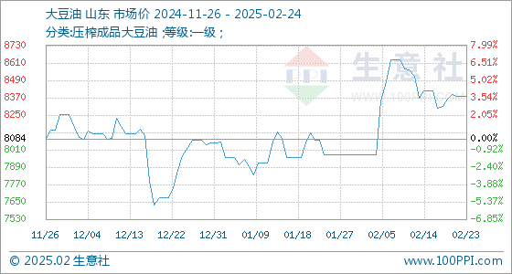 2月24日,生意社大豆油基准价为8380.00元/吨,与本月初(7978.00元/吨)相比,上涨了5.04%。