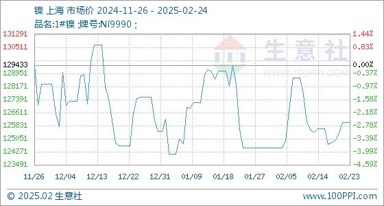 2月24日,生意社镍基准价为126016.67元/吨,与本月初(124516.67元/吨)相比,上涨了1.20%。