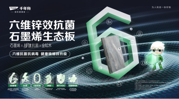 绿色健康始终是千年舟发展的核心根基,科技创新也是满足消费者对健康、可持续生活方式需求的必然选择。千年舟通过新技术、新工艺和新材料,推出“六维锌效抗菌石墨烯生态板”,诠释健康家居生活的价值内涵。