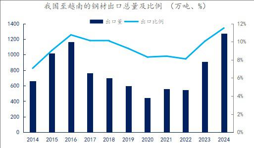 越南是我国在东盟地区最大的钢材出口市场。据中国海关统计,2024年我国出口到越南的钢材1273.8万吨,占我国出口总量的11.51%,越南是我国钢铁第一大出口目的地。越南本土钢铁产能不足,对进口钢材依赖度较高,而我国凭借成本优势成为主要供应国。