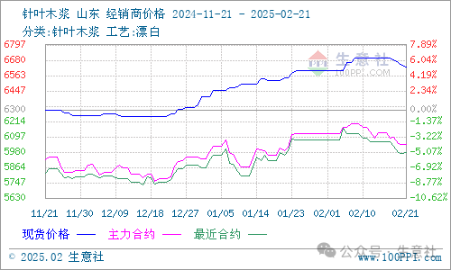上周纸浆期货价格震荡下行,截至2025年2月21日上期所纸浆期货sp2505主力合约开盘价6036元/吨,收盘价6034元/吨,最高价6070元/吨,日跌幅0.03%,成交量13.33万手,持仓137,364手。