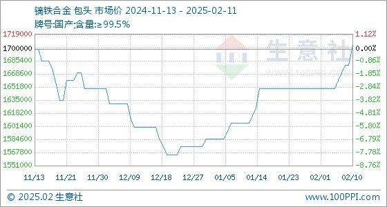2月11日,生意社镝铁合金基准价为1705000.00元/吨,与本月初(1650000.00元/吨)相比,上涨了3.33%。